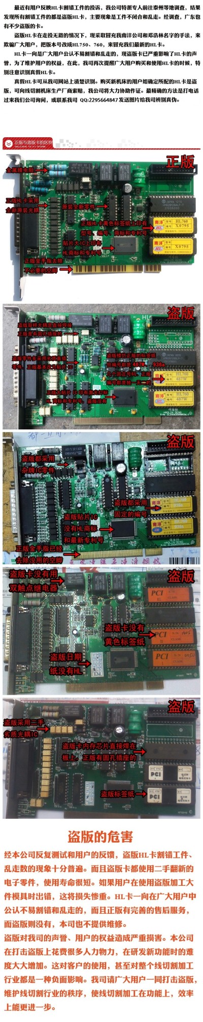 我们在此声明:因市场上售卖的盗版HL线切割机床控制卡对本公司及软件开发者邓浩林先生带来的一切负面影响保留法律上追究的权利,我们将积极配合当地公 安及工商机关开展的调查工作.